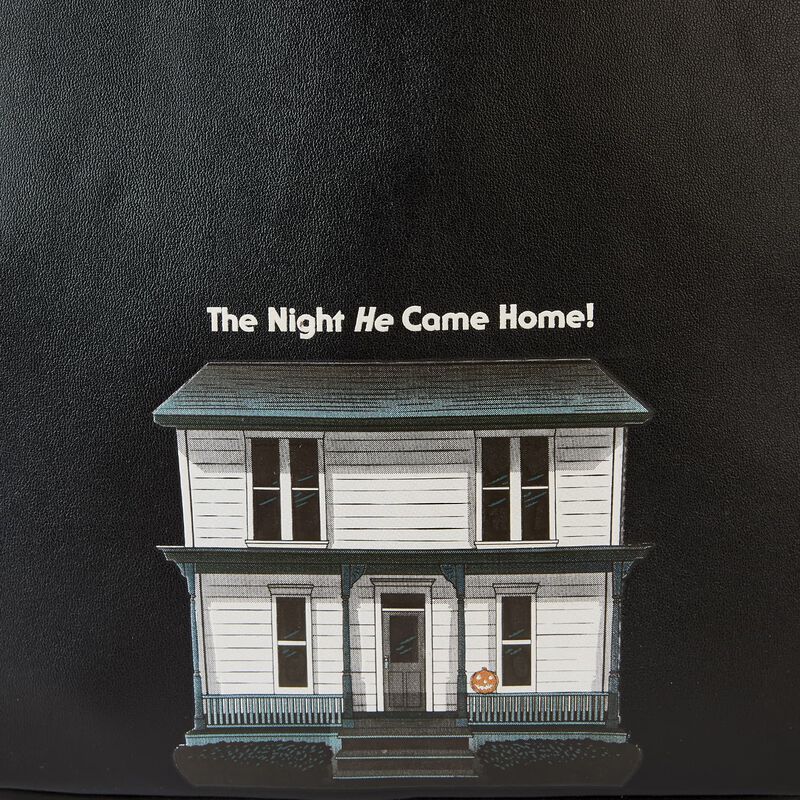 Cue the haunting theme song and look sharp! Make an entrance with our Loungefly Michael Myers Halloween Cosplay Mini Backpack. Michael Myers’ eerie, masked face comes to life in applique detail, rising up over the top edge of the backpack. In the dark, the entire face glows! The front zipped pocket features applique shirt pockets and a collar. A metal zipper charm, in the shape of a knife, is a pointed nod to the legacy of this slasher film. On the back, you’ll find the famous house setting for this classic Halloween movie, along with the words, “The Night He Came Home”—and they glow in the dark! Pack just what you need to enjoy a night of fun watching scary movies at friends’ houses—or simply visit your favorite haunts in style.