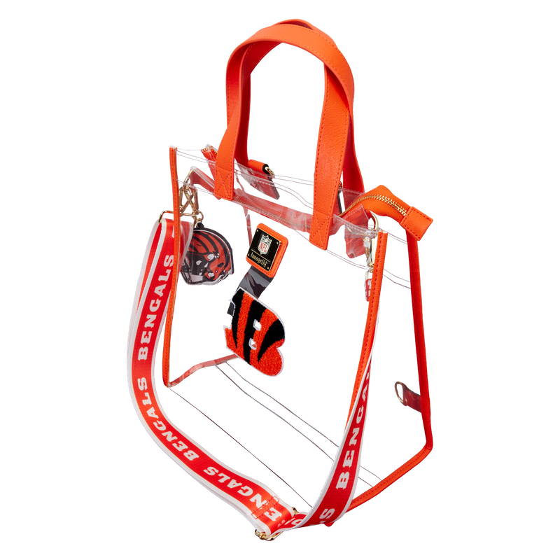 Feeling game-day ready? Cheer on your favorite football team with this convertible tote bag! The clear design makes it easy to bring your belongings into the stadium, and versatile shoulder straps help to keep your bag close as you wander the crowds. A chenille patch of the Bengals logo, a helmet-shaped bag charm, and coordinating team colors give this bag an elevated look. No need to sacrifice your style at the big game – this accessory is the perfect combination of fashion and function.