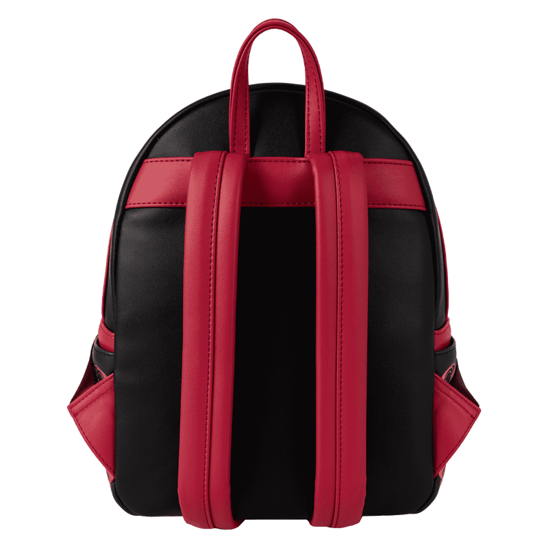 What a beautiful fright! This Bride of Frankenstein mini backpack features a stunning rendition of Frankenstein’s bride in stained-glass portrait style. Her elegant portrait comes to life on the front pocket in vibrant color and embroidered details. She’s surrounded by red embroidered flowers, and gold-foil touches add a dramatic flair. Pack just what you need for a day of reviving your spirits while visiting favorite haunts.